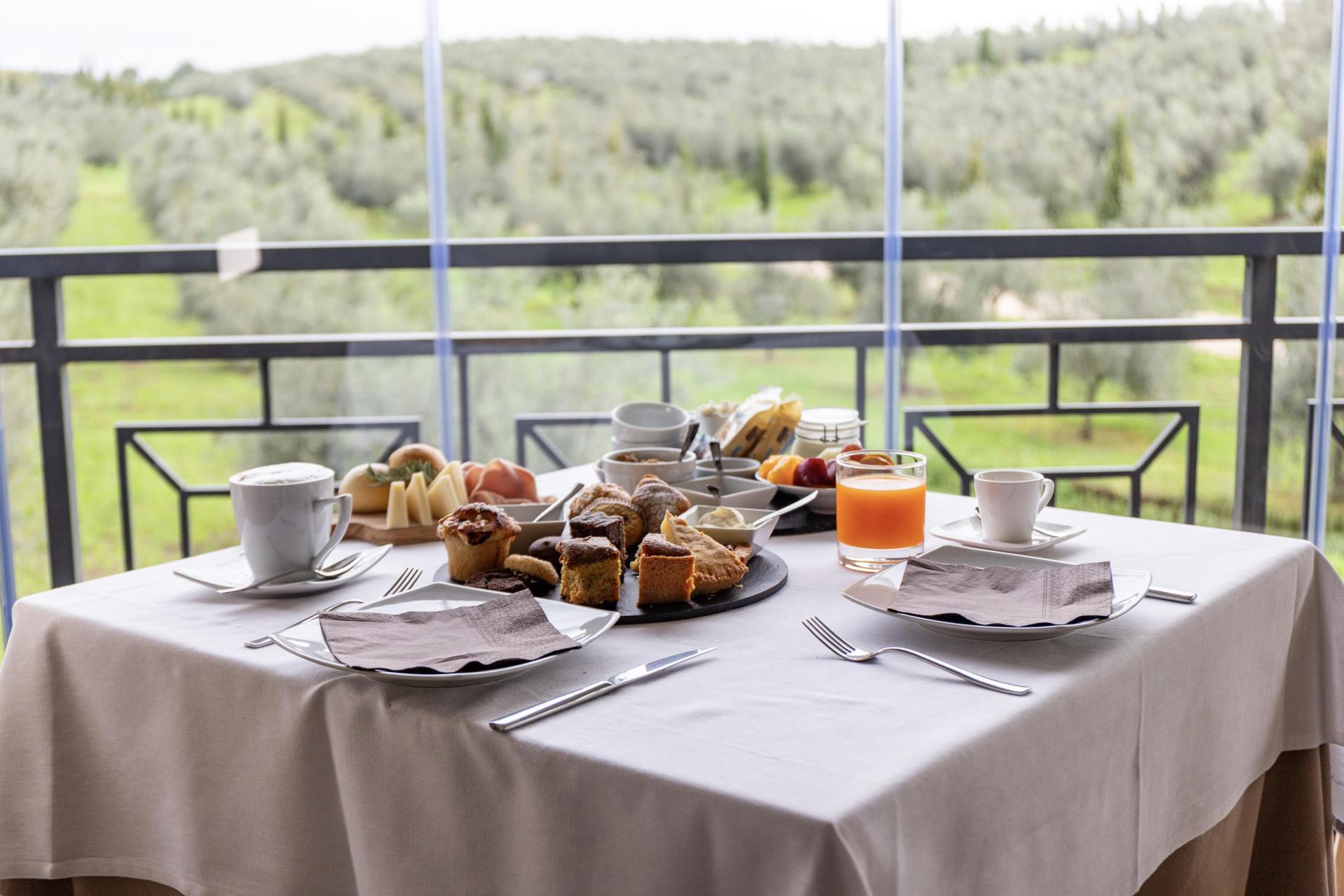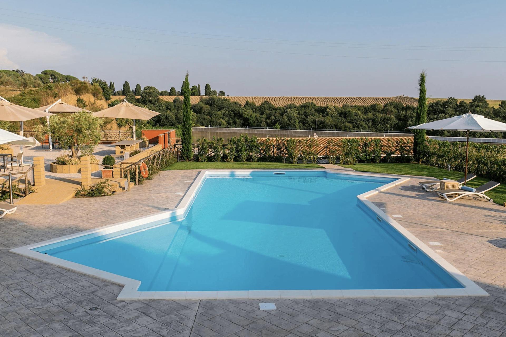 Buiten ligt het zwembad, omringd door wijngaarden en olijfbomen. Er zijn comfortabele ligbedden en parasols en in de zomer is er een klein poolbarretje voor een verfrissend drankje. Vanaf het terras geniet je van een prachtig uitzicht over het omliggende landschap.